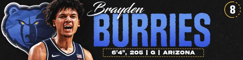 目前,孟菲斯灰熊由莫兰特担任控卫核心。即便莫兰特缺阵,泰·杰罗姆自加盟以来也一直是球队高效且不可或缺的一员,灰熊在过去也曾找到过其他控卫人选。尽管这一位置看似已有保障,但每一位主力控卫都需要一位合适的后场搭档。布雷登·伯里斯若能加入一支不需要他立刻承担过多责任的球队,将会受益匪浅。伯里斯是公认的得分利器,具备无球投射能力,并能在后场防守多个位置。在亚利桑那大学,当他与杰登·布拉德利分担球权、承担更重进攻任务时,伯里斯已经证明了自己能够高效运转挡拆。因此,他完全能够与另一位持球型后卫并肩作战。对于一支选秀顺位并非最靠前的球队而言,伯里斯是一个极佳的选择,也为球队在后续阵容搭配,包括本次选秀中后期的操作,保留了灵活性。